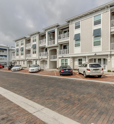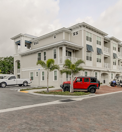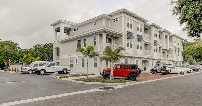 A 3-story, 24-unit boutique apartment complex in downtown Safety Harbor with primarily 2-bedroom/2-bath units, balconies, and elevator access. Built on a tight site, it maximized space without sacrificing charm.